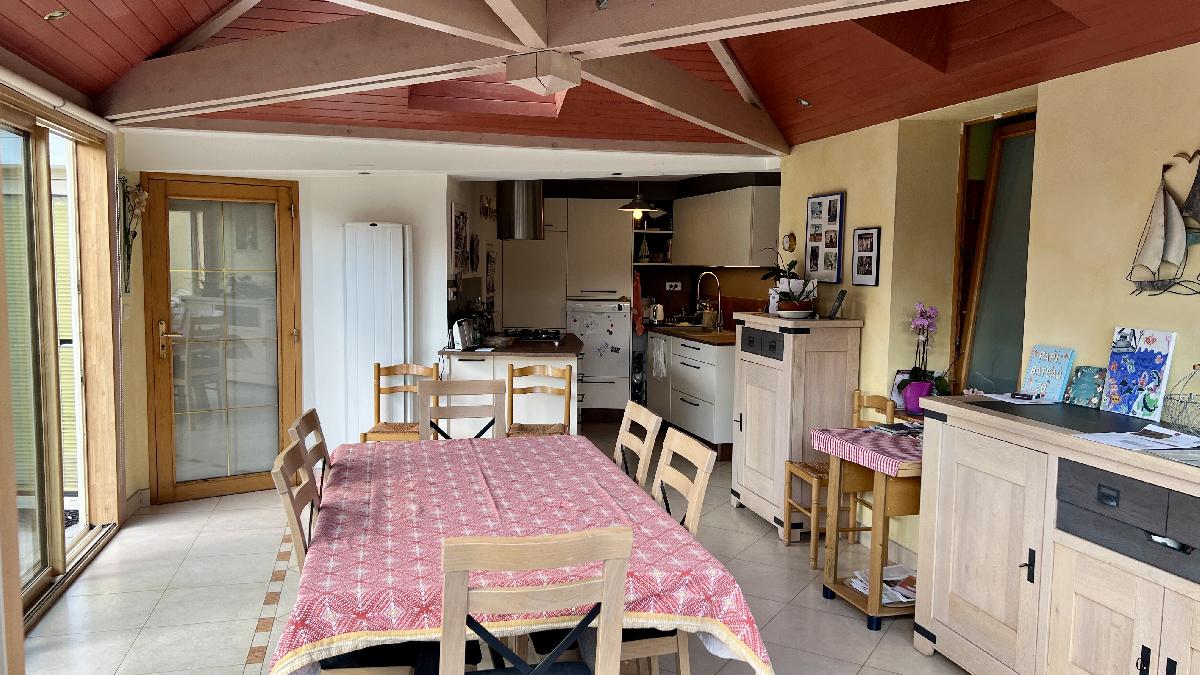 À l’arrière, côté jardin, une cuisine moderne, aménagée et équipée, s’ouvre sur une lumineuse salle à manger installée dans une véranda en bois récente. Grâce à ses larges baies vitrées, elle offre une vue imprenable sur un jardin intime, magnifiquement paysagé, parfait pour vos moments de détente.