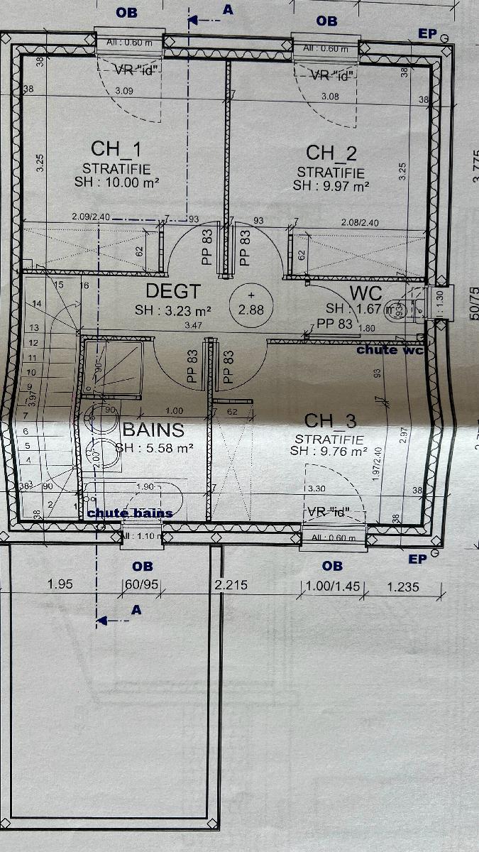 A l'étage, 3 chambres dont 1 avec grand placard, 1 salle de bain (avec baignoire et douche) et un wc séparé.
