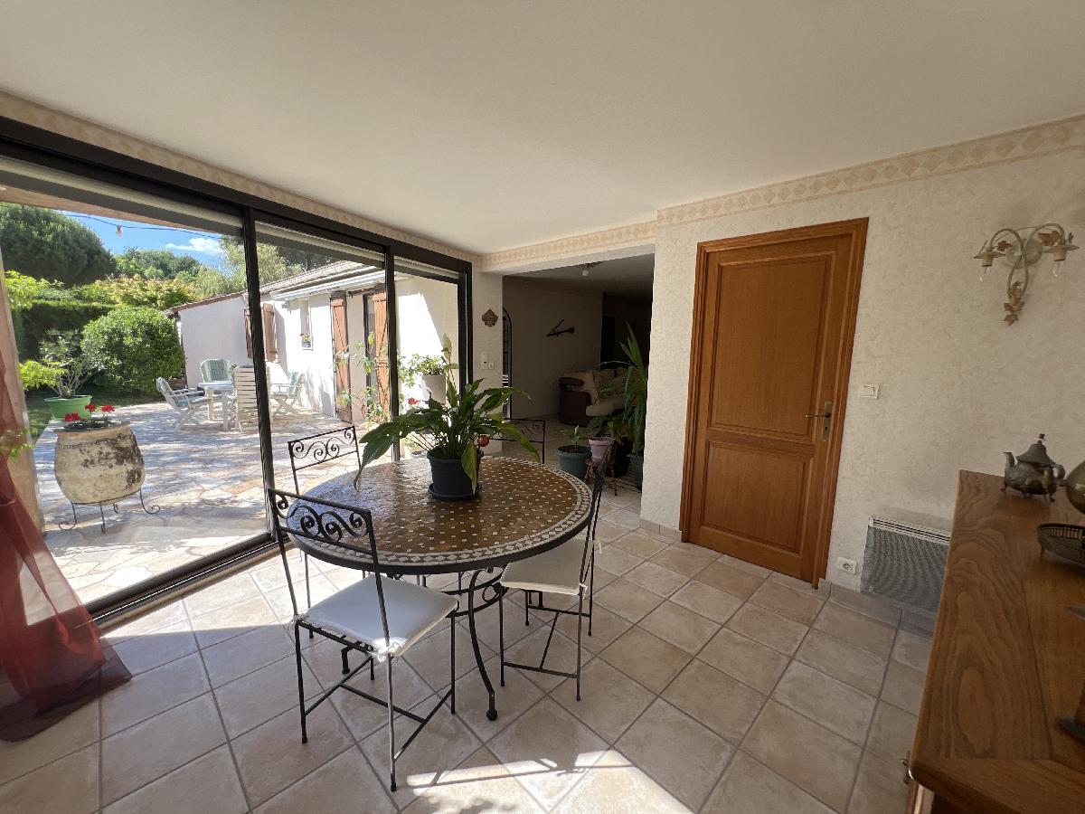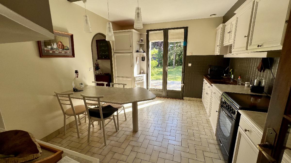 – Une salle à manger lumineuse dans une extension de 2000, dotée de grandes baies vitrées offrant une vue magnifique sur un jardin arboré (chênes, pins, noyer, etc.).